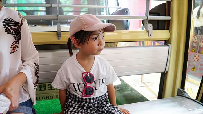 坐上缆车的小朋友内心有点小激动,有点喜悦却不知道等下面对的是什么样的游玩方式和风景,所以表情看上去还有点忐忑。有点尴尬的事,大家要注意下,园区不让自带食物,任何食物都不行,在门口会有开包检查,查到的食物可以在旁边寄存,但闭园之前必须取走。
