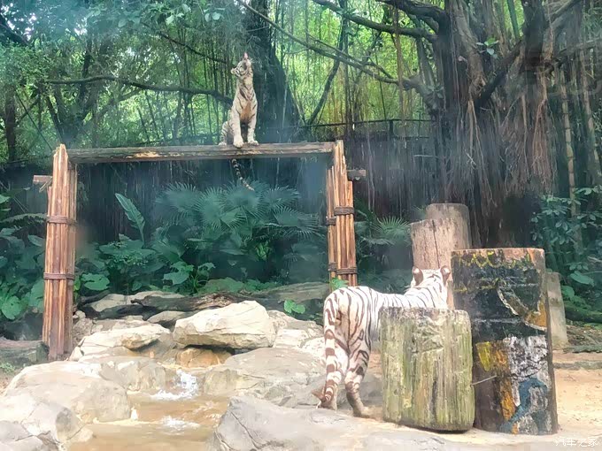 出了青龙山走不了多远就是 白虎跳水 ,是长隆野生动物园人气很高的表演项目,每半小时表演一次。因为表演频率比较高,所以人相对不是那么多,基本上稍微早去一点就可以站在玻璃前面看。