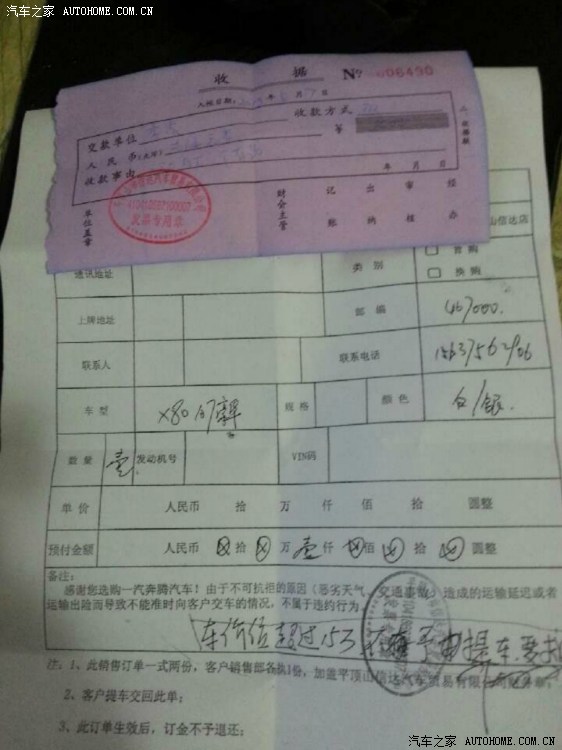 2006年买了第一辆属于自己的小车——哈飞路宝,开了接近3年4W多公里。09年换了——嘉年华三厢,到今年正好3年,也是4W公里左右。今年又想换个SUV,就反复的在论坛上看,基本上没看合资车,原因一:欧系、美系的买不起,二:韩国车和岛国车不想买,三:路宝车开了三年从没修过,这几年国产车也没少出精品,四:有点小小的爱国情结。所以一直在网上及论坛看车,看中的车大概顺序为:中华V5-广汽-GS5-一直到X80出现,V5其实不错就是有点小了,后排空间不足,反复看过实车及试驾后放弃;GS5说实话空间不输给80,内饰及做工超过80,前后看了不下2个月,团购群也参加的有,最终放弃的原因是屁股不能接受及80的出现。忘了是什么时间在网上见到80的照片,真的感到惊艳!然后在网上查到当地的4S店电话,直到4S店有实车去试驾及5月7日下订。
