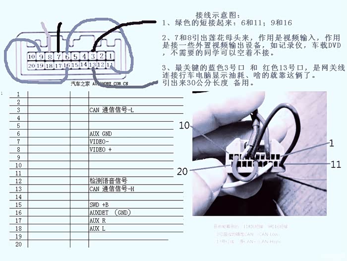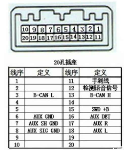 坐下第三个:比较重要的CAN线插口,网上有的叫它破解线的就是这个口(做一条这个线的成本大约20元左右!)。这个插头上的3号口和13号口是跟行车电脑通信用的,类似于行车电脑过来的数据线,从这里引出线来连接到“某处”(下文会详细讲解)后,可以让DA屏跟汽车电脑“通信”获得油耗信息、倒车轨迹随动显示、时钟跟仪表盘同步、蓝牙电话等等很多功能!是关键的一个插头。