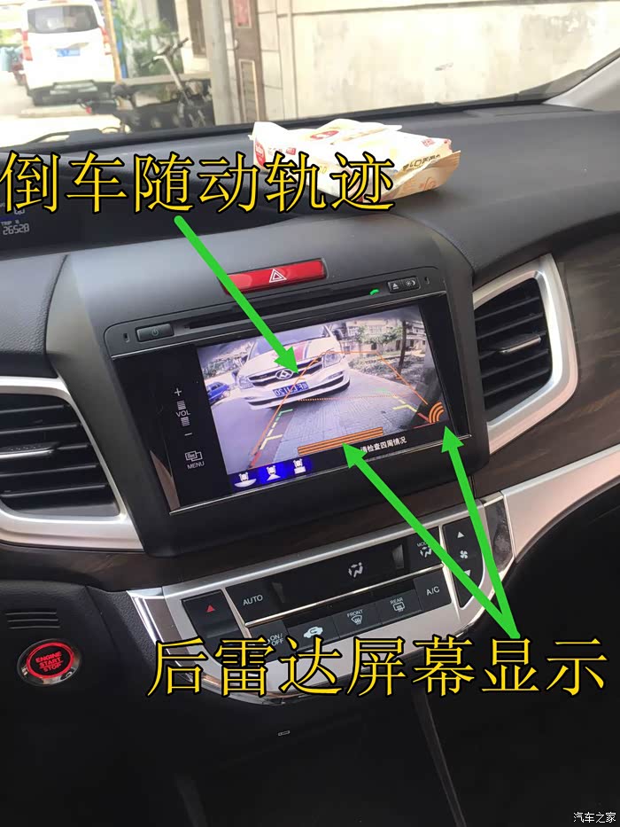⑤、倒车影像、倒车轨迹随动转向、倒车雷达在屏幕显示(靠近物体后屏幕有提示)。
