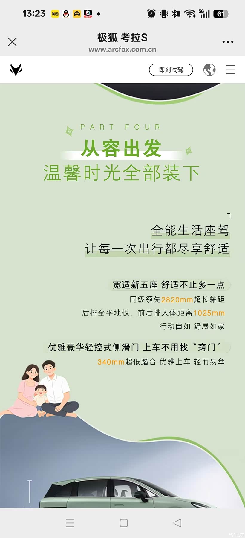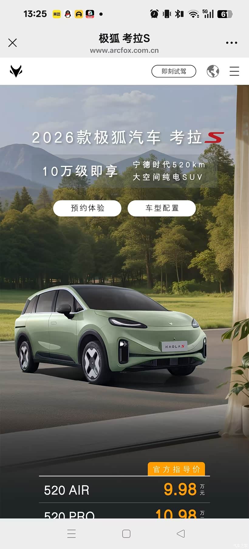 作为家里娃刚上幼儿园的二胎家庭,选车的核心诉求始终绕不开「安全、省心、适配亲子场景」。之前试驾过不少家用纯电车,要么空间够但亲子配置敷衍,要么配置花哨却续航拉胯,直到摸到2026款极狐考拉S的方向盘,才算找到精准戳中家庭用户痛点的车型。这款10万级紧凑型纯电SUV,全系标配宁德时代520km续航,把母婴级健康座舱、亲子交互黑科技和实用场景功能拉满,试驾一整天跑了城区通勤、近郊露营两段路,实测下来每处细节都透着对带娃家庭的诚意,今天就跟车友们好好唠唠真实体验。