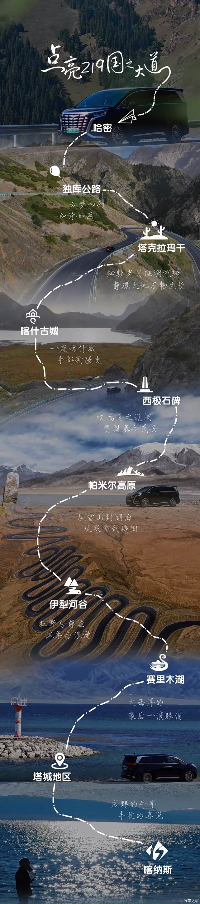 新疆的美景最精华的部分,大多集中在219国道沿线。耳熟能详的帕米尔高原、塔克拉玛干沙漠、那拉提草原、赛里木湖、喀纳斯等等,在219的串联下,重新奏响生命最美的乐章。