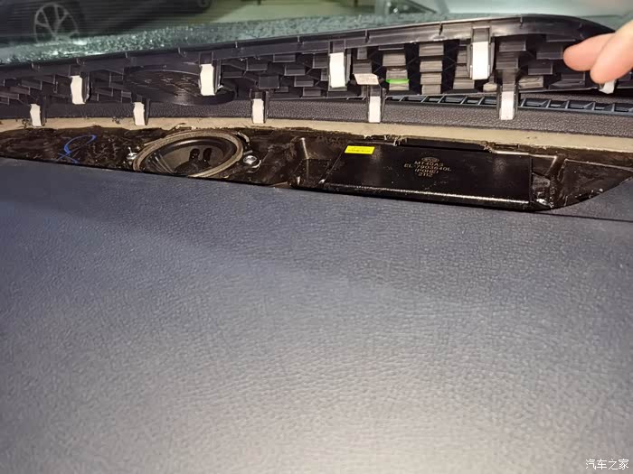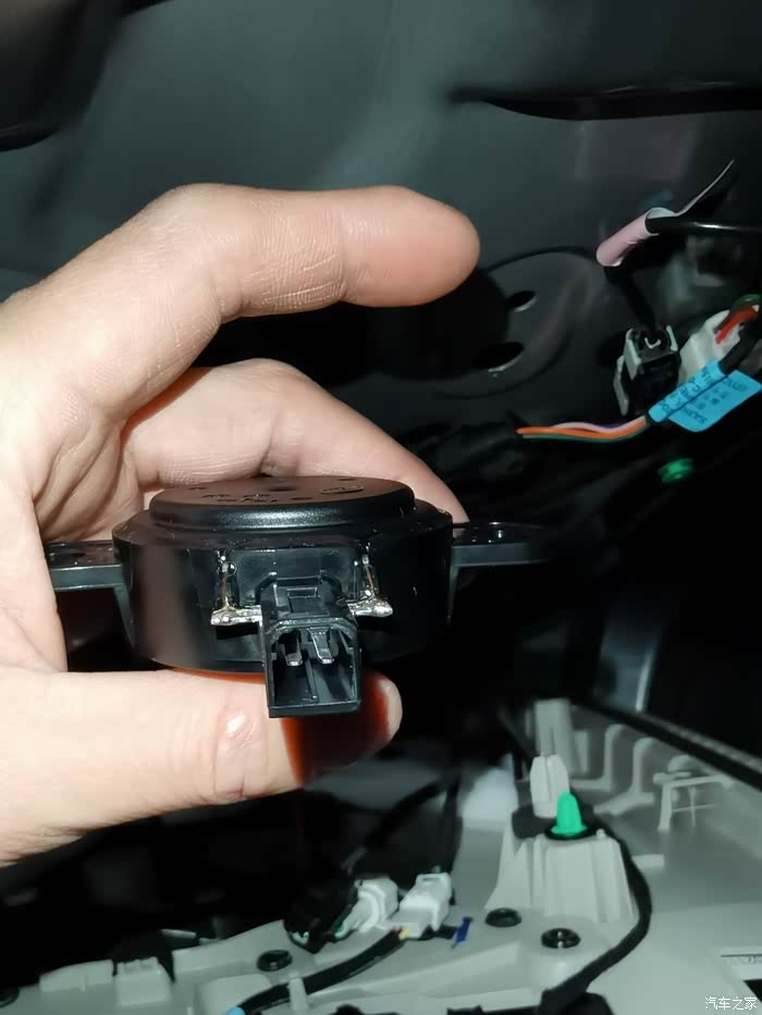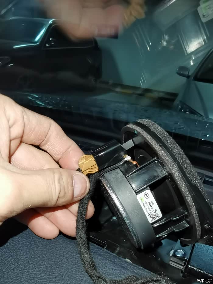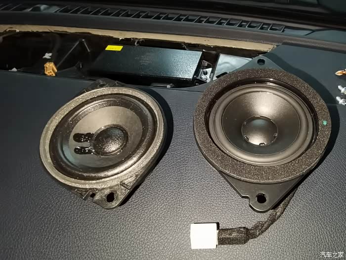 直接插头对插即可完成安装 这里丹拿中置尺寸大于原车喇叭 安装后厚度增加 需要对喇叭盖板反面凸起的部分做切割改造 否则盖板无法安回 盖不紧 另外原螺丝孔位置差异太大 也无法上螺丝固定 但是盖板安回后可以压紧喇叭 所以可以不上螺丝