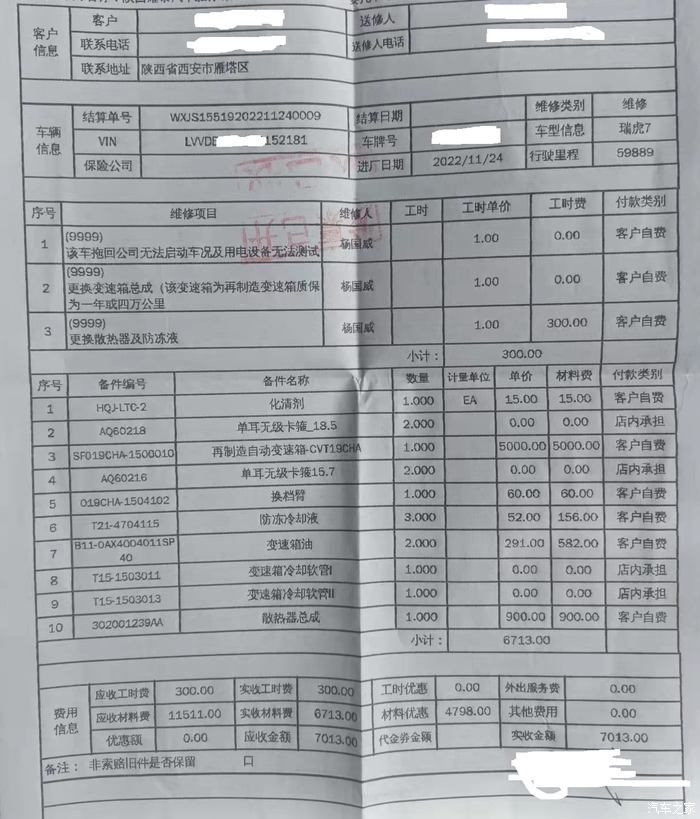 2016年耀臻版瑞虎7。2022年11月,因钢带断裂2次,在4S店自费更换一台原厂变速箱,质保一年。这不是噩梦的结束而是开始。从此,就踏入漫漫维修之路,更换时里程刚到60000公里。直到今天不过65000公里。