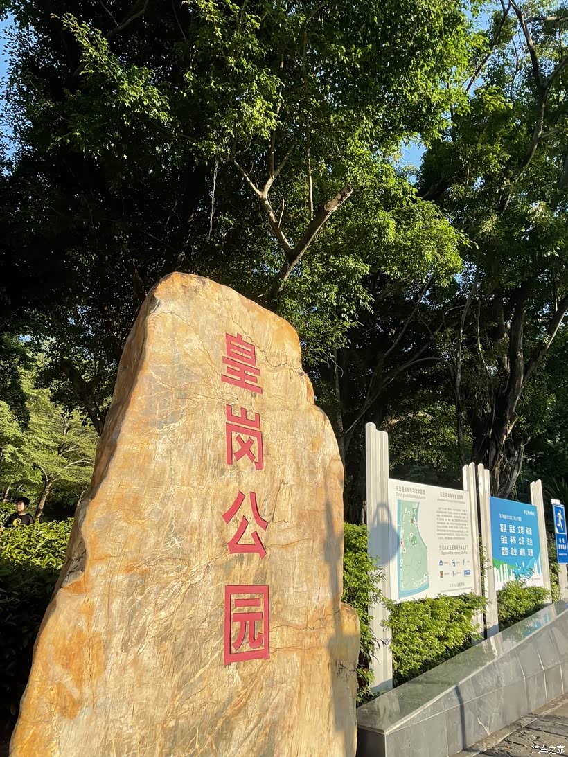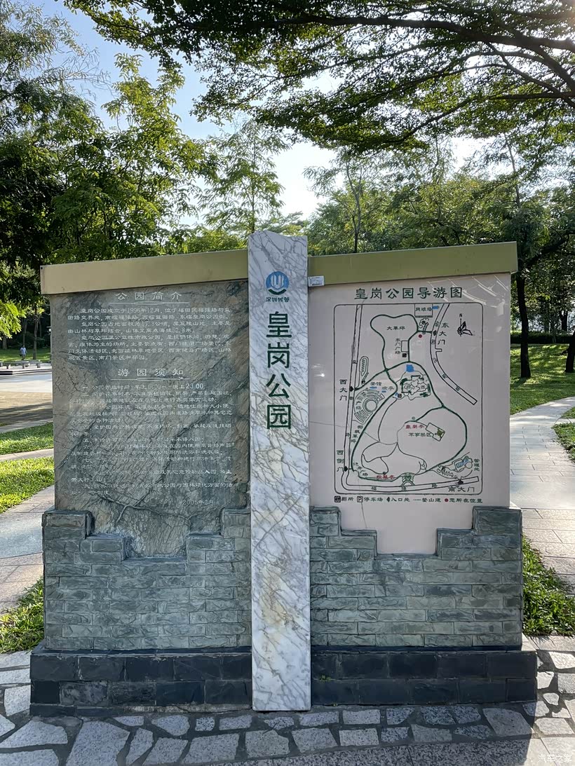 皇岗公园位于深圳福田区,南临福强路,西临益田路,东与"云顶翠峰"、北与"共和世家"小区相邻,处于福田中心区南北中轴线的南端。公园占地面积为17.3公顷,现有绿地面积为151000平方米,其中草地面积为96000平方米,山林面积为55000平方米。主要景观有西门休闲广场景区、下沉广场、人工塑石、观景亭廊等。