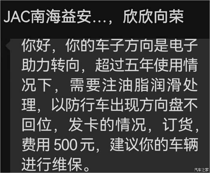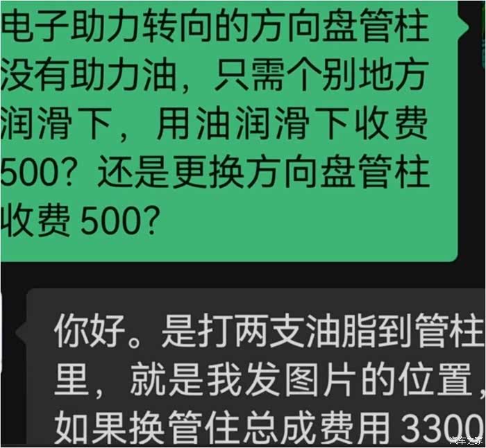 4S告知每5年需给小3电助力电机里的涡杆涡轮重新注油润滑,避免打方向时卡顿,不自动回位现象发生,收费500!