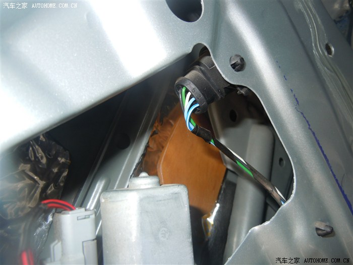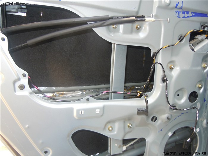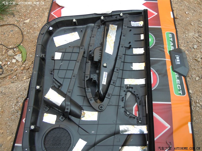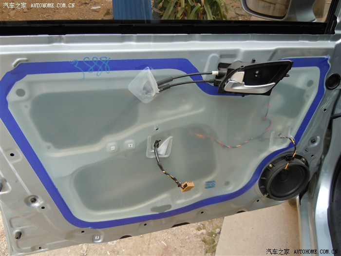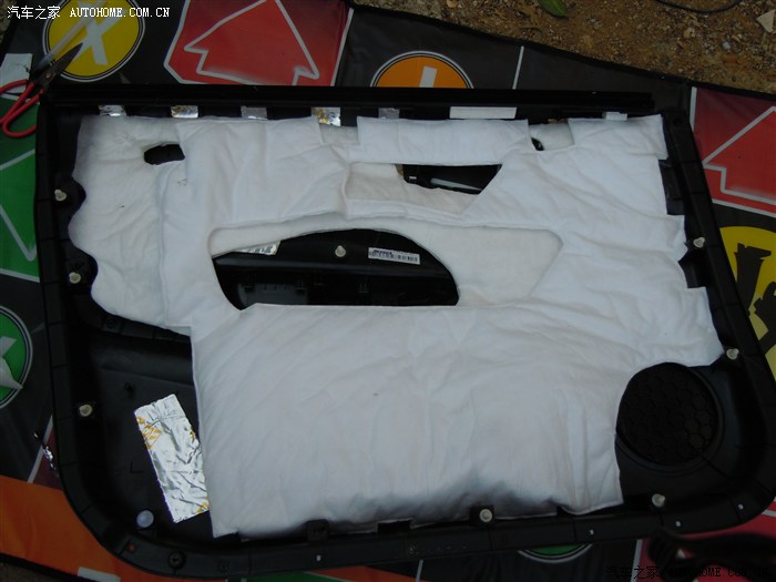 取下三颗螺丝后,正副 驾门要记得先把前面三角处坚着的内饰板取下,那里我忘记拍照了。门板取下后把里面的防水膜撕下并保持平整,方面后面使用,省时省力。然后接着擦干净门内的灰尘.最好把喇叭一起拆下,这样更方便粘贴