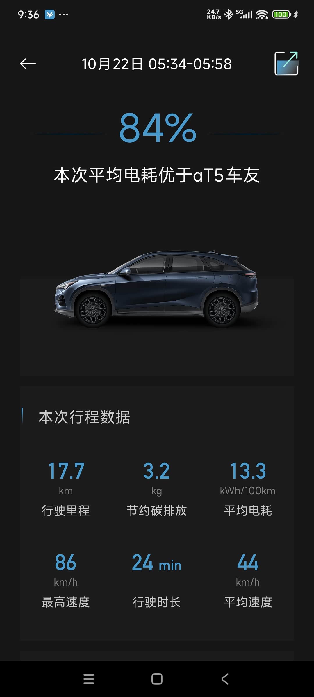 24分钟后顺利抵达公司,中控屏的行车报告让我眼前一亮:全程17.7公里,开启空调和音响的情况下,电耗仅13.3度/百公里,总耗电量不足3度。用极狐APP的电卡充电,每度电不到0.5元,这次通勤成本居然还不到1.5元!