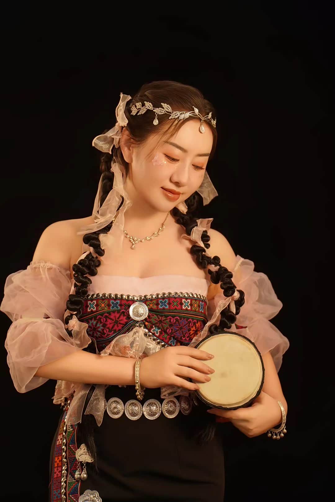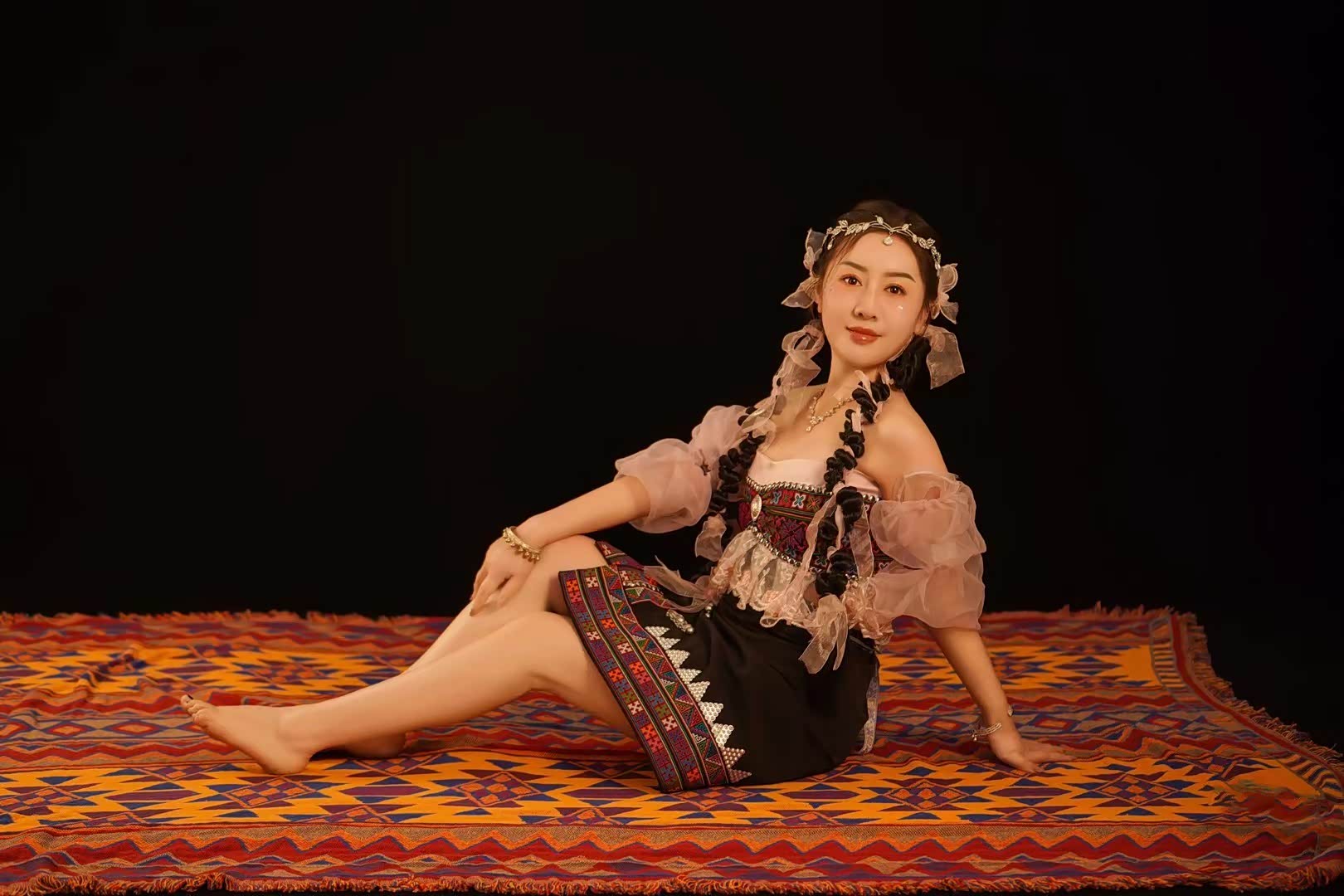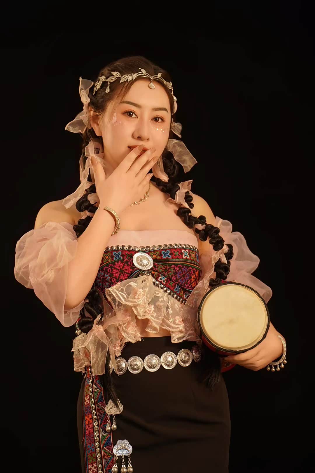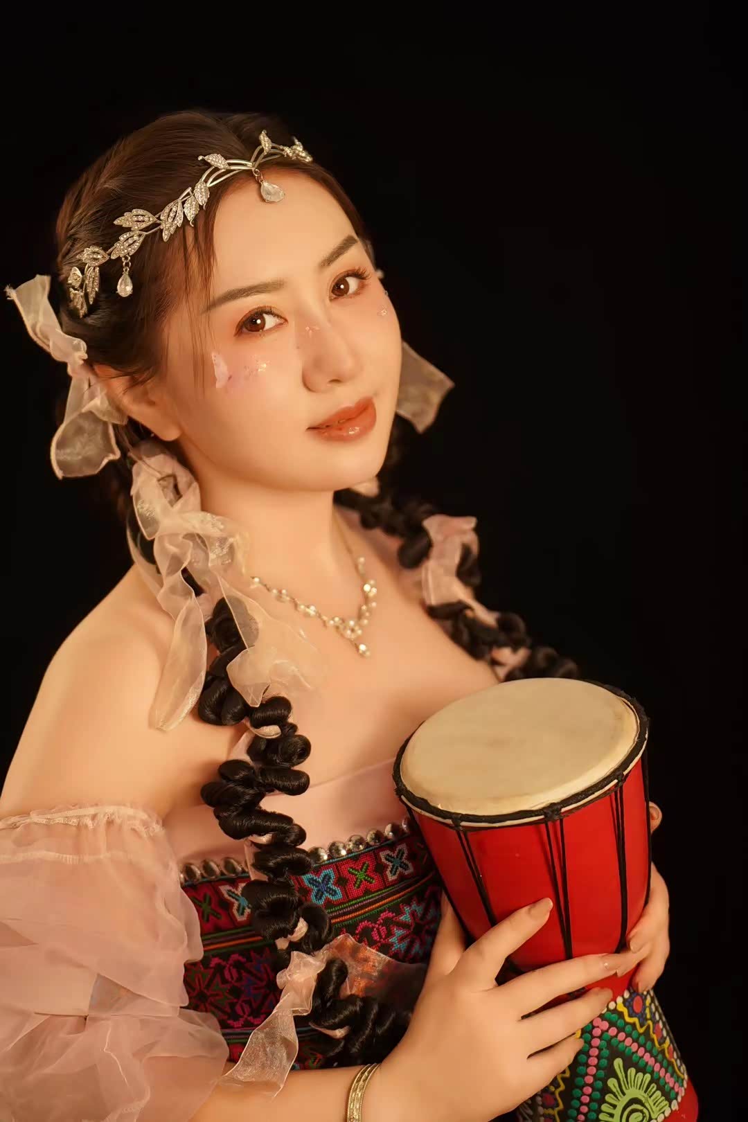 暮色四合时,蒙古包外亮起了串灯,暖黄的光透过毡布缝隙渗出来,和天边的橘红色晚霞连成一片,苏野换上了件黑红色吊带裙,领口随意地敞着,手里拎着手拍鼓,靠在蒙古包的木柱上。举着相机对准她,她突然抬手把啤酒瓶往嘴边送,另一只手撩起裙摆,露出小腿上绑着的皮质腿环,眼神在暖光里变得迷离又锋利。
