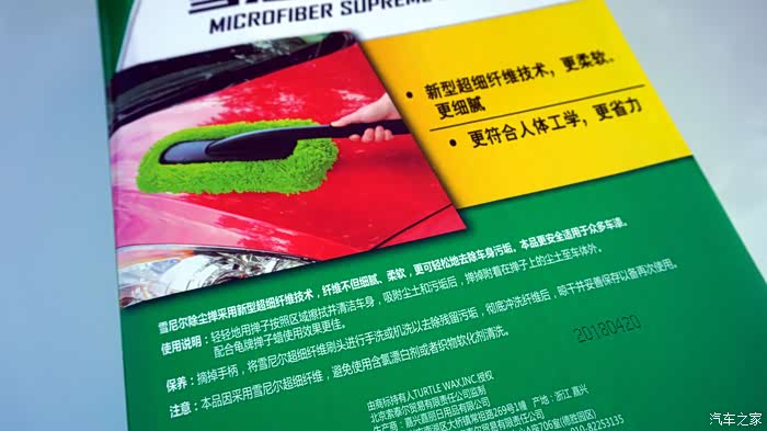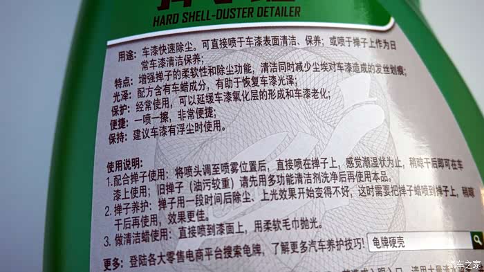 目录除尘掸外观和特点介绍掸子蜡作用和外观介绍除尘掸干刷效果测试配合掸子蜡的效果测试龟牌除尘套装的试用总结除尘掸外观和特点介绍相信很多车友都会遇到这样的状况,爱车刚刚洗完车途径尘土漫天的路段或是在地下车库停放后,爱车表面细看之下会有满满一层灰尘。这样的情况往往会让车主感到烦恼,因为车子确实没有污渍无需刷车,但是在机盖以及玻璃等处又有明显的灰尘存在。这时候如果有一套专业的除尘套装,这种尴尬便会迎刃而解了。龟牌可以说是大家非常熟悉的汽车美容用品品牌,特别是龟牌冰蜡等产品更实在车主圈内具有很高的知名度和好评度。本次试用测试的这款由除尘掸和除尘蜡组成的除尘套装,便是来自龟牌出品,下面便同大家细细分享它的...