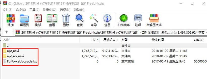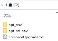 ③步:将固件压缩包中文件及文件夹(npt_navi、npt_no_navi、FblForceUpgrade.txt 共计3个)拷贝到U盘根目录(建议适用WINrar软件进行解压缩,已防乱码出现问题,同时u盘中禁止存储其它无关文件)。