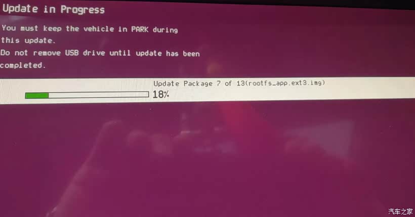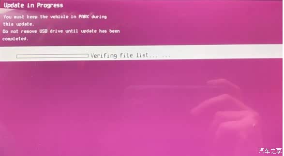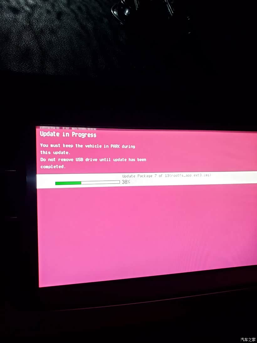 ④步:此时中控黑屏几秒,喇叭传来彭的一声,屏幕出现红底白字升级界面,进度条上方显示“Do not remove USB driveuntil update has been completed”提示并伴随进度条滚动,此时应等待(等待时间5-30分钟不等),不要触碰任何车辆按钮。(注意:进度条可能会短暂无响应,仪表盘伴随T-Box故障报警,是正常现象。此时千万别心急拔U盘,否则车机会大概率损坏)。
