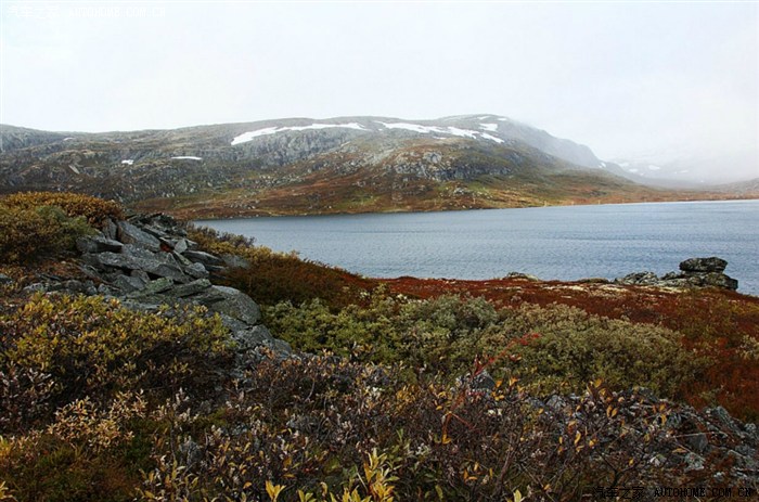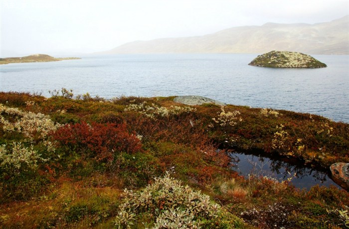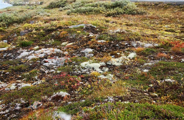 湖面雾气时大时小,寒风扑面。在这萧杀的气氛中,岸边色彩斑斓的地衣却强烈地刺激着我们的眼睛。