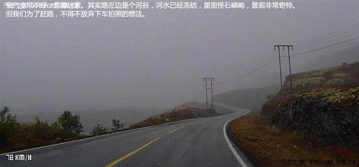 经过湖泊后,雪越来越大,雾气也越来越重,我开始有点怕,因为我不清楚这样的路况还要维持多久。现在已经是下午3点多了,如果天黑前还是这样,将会非常危险,所以我不能停车,要抓紧时间尽快离开,以下图片只能用视频截图来展示。