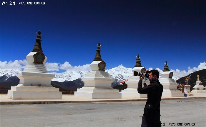 今天要与白马雪山和梅里雪山有个约会,所以没有像昨天那样睡懒觉,起床时间设在七点钟,争取早点上路夺回昨天耽误的时间。退房后给满身尘土的战车洗去征尘,继续向西进发。一出镇子便遇上道路施工,还好,只是耽搁了几分钟。在翻越白马雪山的上山途中看到山谷中一座沐浴在晨光中的雄伟寺庙,这就是鼎鼎大名的东竹林寺。道路一直蜿蜒盘旋而上,这个季节真是进藏的好时候,气温不是很低,而雪山的积雪还没开始大面积融化,不仅雪峰上面都是白雪皑皑,雪线也一直延伸到海拔三千米左右的路边,有的积雪甚至达到一米多厚,随时可以停车打雪战,哈哈。离山顶垭口不远可以看到一座写作《白马雪山国家级自然保护区》的牌坊,这里是滇金丝猴等各类野生动植物的牺息地,有大面积的原始森林。十二点左右,到达白马雪山垭口,看了海拔计,显示高度为4150米,阳光照射非常强烈,不过气温却是非常的低。山上的路况还不错,下山途中又开始修路了,宁静的雪山却因为G214国道的扩建变成了一个大工地,到处都在修路钻隧道。估计一年以后,路程缩短,却再也没有去白马雪山之巅一览众山小的机会了。刚转过一个山梁,一座金字塔般的雪山耸立在眼前,那,就是梅里雪山,激动啊!