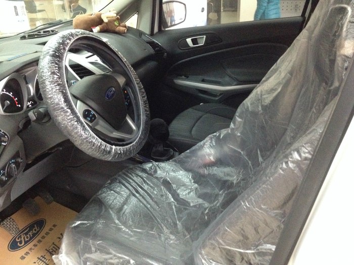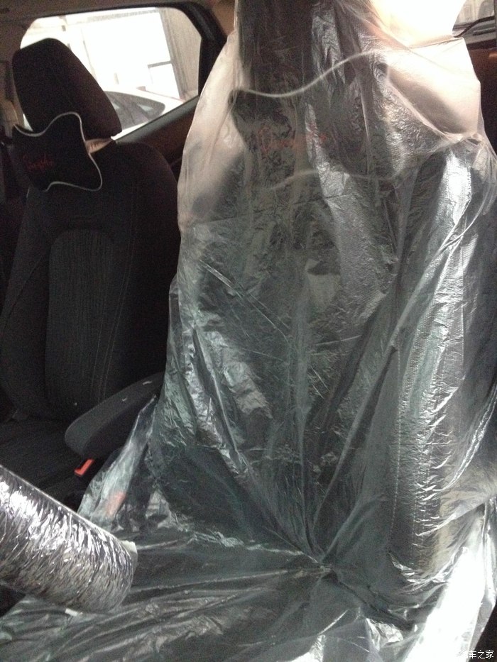 在接待区,给套上了一次用的座垫、方向盘套、脚垫。