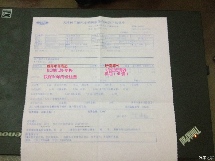 最后上上保养清单。其实也就更换了机油和机滤,那所谓的快保30项专业检查,除了胎压,我也不知道他们还检查过些什么。