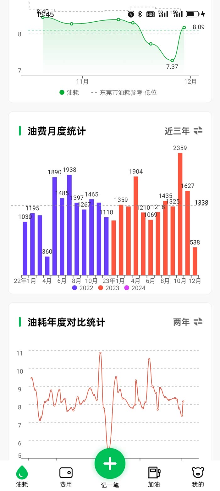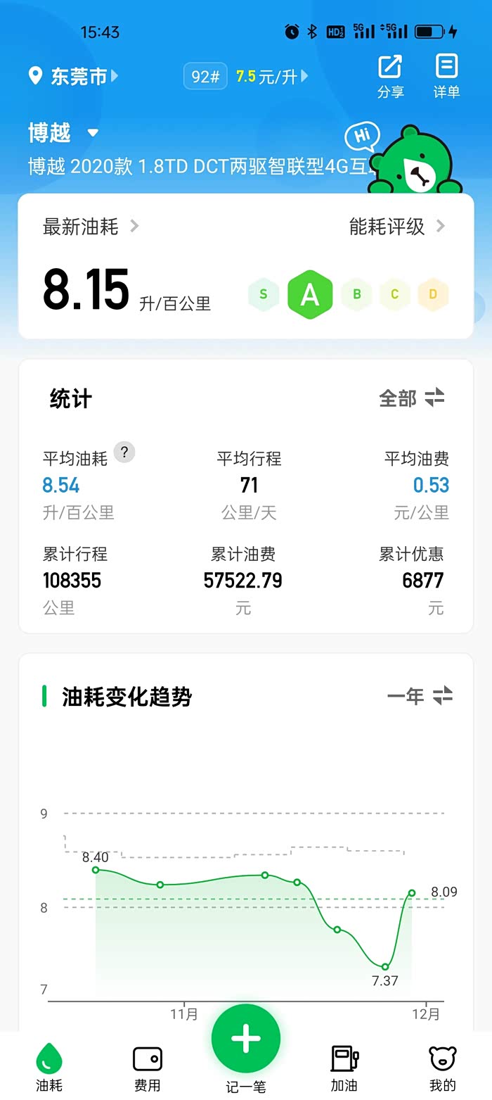 由于我每天行驶里程在上下班来回通勤一天110公里,荣威D7DM纯电续航在125左右(实测),平时我上下班基本使用的纯电模式,所以只有充电成本,东莞地区私人充电桩设置在0点至8点充电费用约0.28元每度电,我一个月行驶里程约2500公里的电费(自己充电桩加偶尔外面充)平均120元左右,即每公里行驶成本5毛钱不到,百公里5元不到(比坐公交还便宜哈)。而在春节、国庆或回老家时会使用到油,核算下提车到现在加油优惠后花费共1070元。充电及加油总费用为2270元,换算成百公里:2270/24000*100=9.45元/百公里。