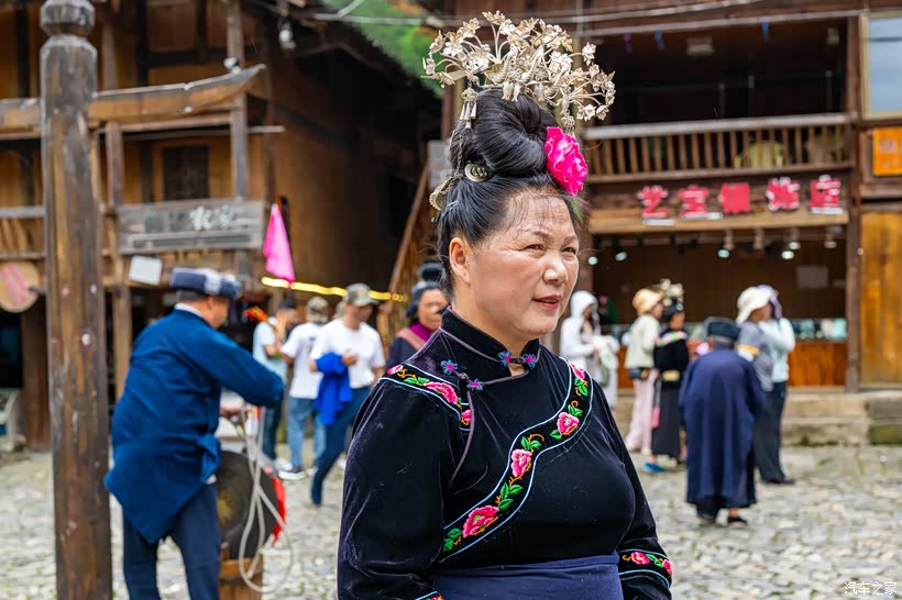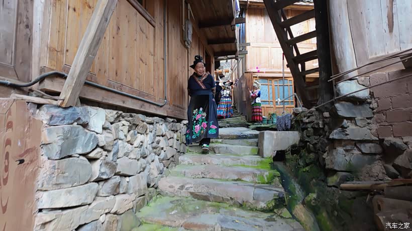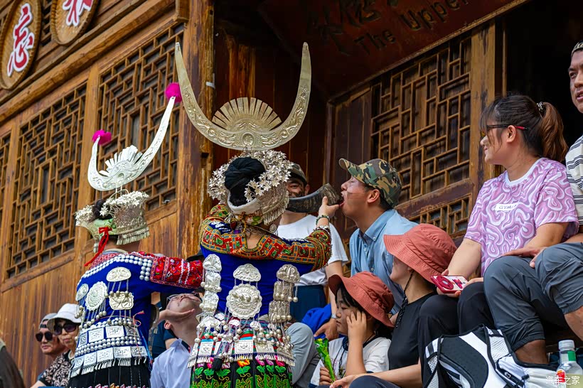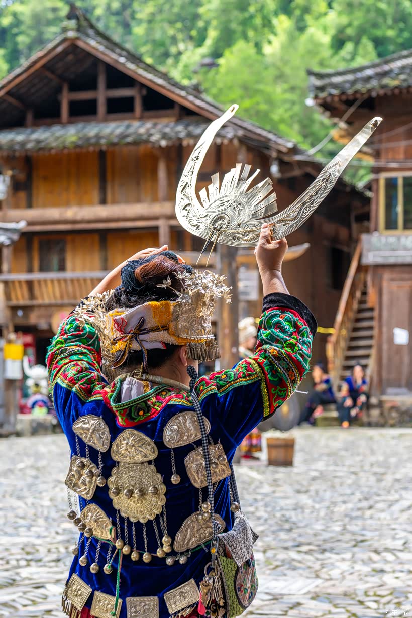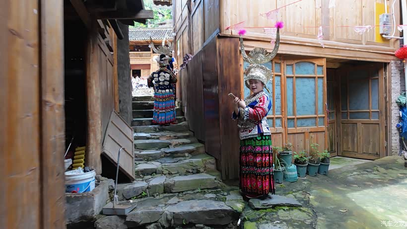 忽然一阵叮咚作响的金属碰撞声从吊脚楼群中传来,似乎还有歌声、音乐声。不会吧,竟然如此幸运,难道赶上了苗族的歌舞表演?赶紧停车,寻着声音找去。