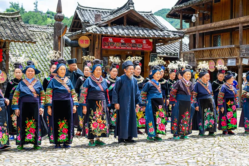似乎全村都来了,围坐在广场四周,老少盛装,女子服饰遍施图案,刺绣、挑花、蜡染、编织、镶衬等多种方式并用,做工考究,苗族女子都精心打扮,她们绾发高耸,头上插戴锦鸡银饰,身穿开襟短绣衣,外着绣花百褶长裙,裙前后系着长方形花围腰,腰间挂满各色手织花带,颈戴银项圈,脚穿翘尖绣花鞋,简直了。赶紧欣赏一下吧。