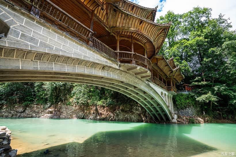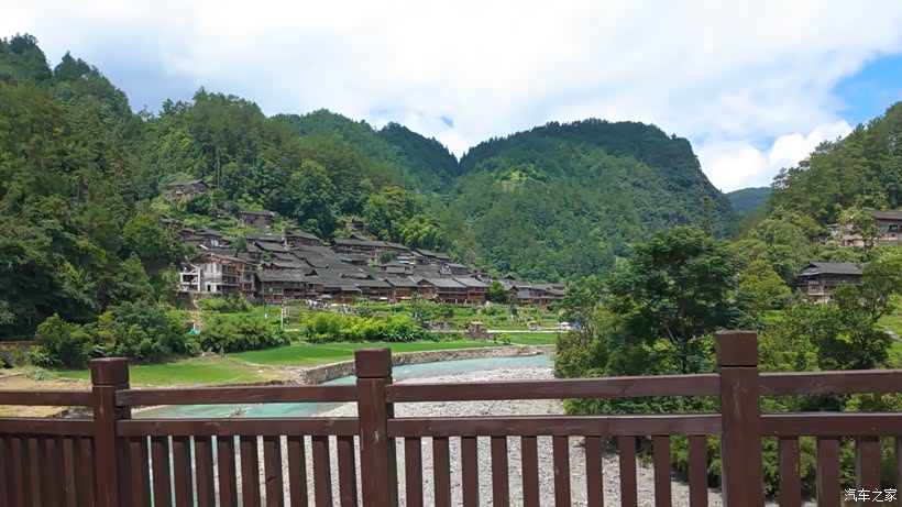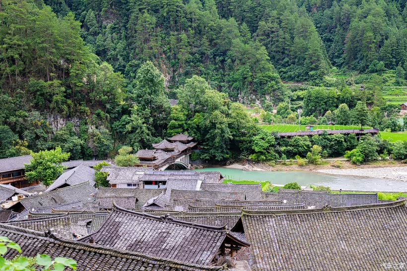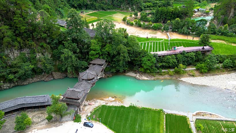 沿着唯一的逶迤山路,没开多远就到了一大片吊脚楼群前,道路的另一侧是一条蒂芙尼蓝色的河水,著名的风雨桥伫立在河上。