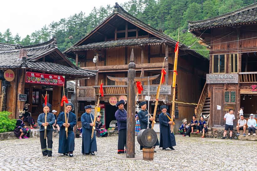 郎德苗寨景区,有上寨和下寨,上寨更为人们所熟知,以百年历史的吊脚楼群、风雨桥等苗族特色建筑闻名,作为2008年北京奥运会圣火传递途经的唯一苗寨,让郎德上寨更是名扬天下。