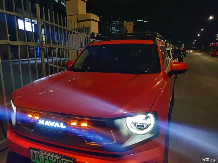 首先给大家看看我这辆大狗的前脸,我这是一辆二代哈弗大狗,而且还是一辆PHEV版本,也就是一辆混动版大狗。可以看到我给它的前脸加了两处灯光,一个是中网格栅灯光,一个是我把HAVAL的LOGO换成可发亮的灯光了,在晚上的点亮效果还不错。