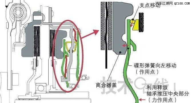 通过这个上图的蝶形弹簧,实现自动修正支点的位置。从而保证在踏力不变的情况下,离合器摩擦片可以压紧