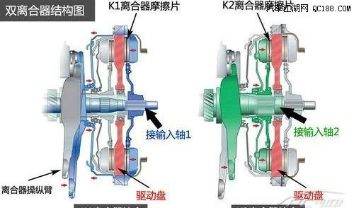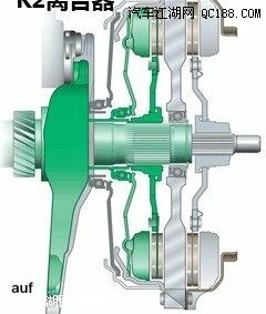 DSG双离合器总成的基本结构和原理,出现问题的就是这个K2离合器,也就是图中绿色部分,直径较小的离合器摩擦片是负责2档,4档,6档和R档传动的离合器摩擦片!