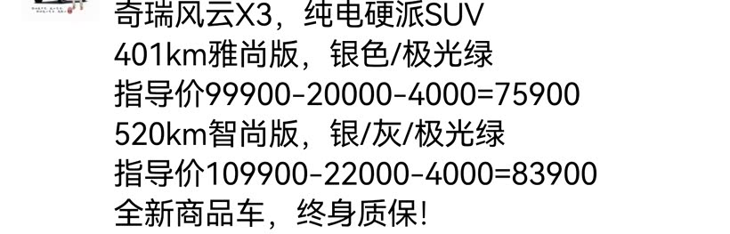 奇瑞风云X3,纯电硬派SUV福利来袭