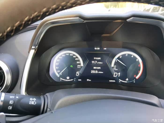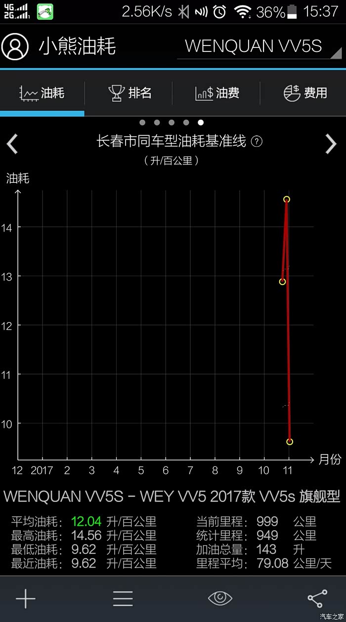 接下来说说油耗问题吧,这也是大家共同关注的。其实我想说,SUV你想要多省油?看看同等重量,同等级别的车,有几个真实油耗是在9、10个以下的呢?既然买了就别考虑这个了。好了,说说我的吧,本人开车脚比较重,急加速急刹车那种,没办法,性子比较急。所以油耗方面当然不会太低。刚从4S点开出来的时候油表是12.6个油。开了一天变成11.多,10月28号贴完车衣正式开始使用。现在是11月10号,表显是9.5,最低到过9.2,9.2是跑国道的时候达到的。用小熊APP测试是11个多。这表太不准了。基本就是表显+2基本差不多吧。目前公里数是1200多公里。等换完一次机油再看看油耗吧。