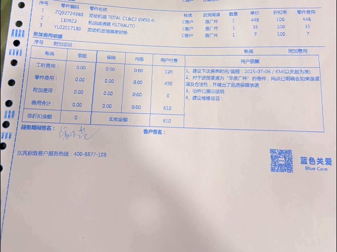 后面跟东风标致官网确认,他们回复:无权干涉保养人员的做法。