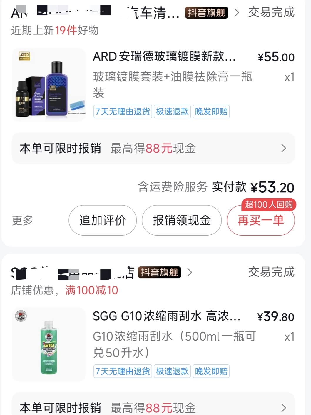 洗车这块我主打一个“自给自足”,买了玻璃镀膜、浓缩雨刮水、洗车水蜡这些耗材,总共花了110多块,平时自己在家洗,最近买了一张76.5元的全车精洗券,准备过年回家前用,把车洗的干干净净的开回家。算下来洗车全年也就200块不到。