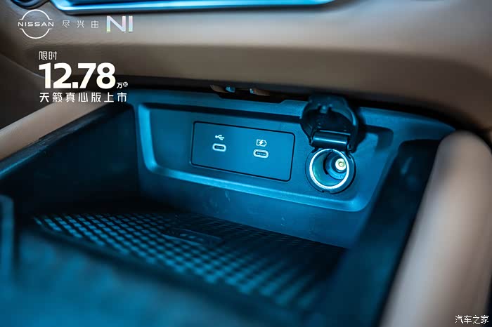 下方带有Type-c的充电口和一个点烟器接口,前方还有放置手机的存放空间。