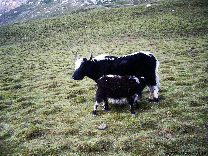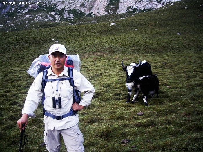 这连绵几十里的马牙高山草甸也是藏族牧民的夏季牧场,牧草丰美,养育着这里的生灵.马兄弟正在跟牦牛母子和合影,看,母牛正虎视眈眈盯着马兄弟呢!