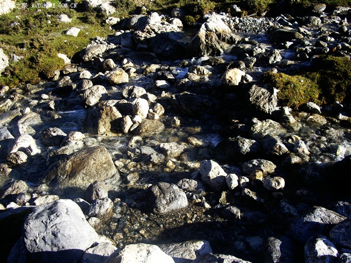 高原暖阳照在身上暖烘烘的,溪水在脚下流淌着,清新湿润的空气滋润着我的喉咙,溪水发出低语,水面像透冰一样,起着旖旎的水绉。晶莹的溪水像一条剔透的银练在脚下抖动翻滚。真想在这潺潺马牙圣水溪流中洗浴一下一身的凡尘,抬望马牙主峰还在远方。。。。。。,只好亲吻你圣洁之水来滋润--我得身躯!