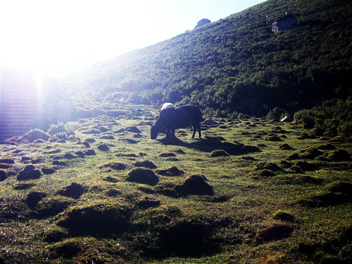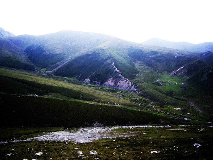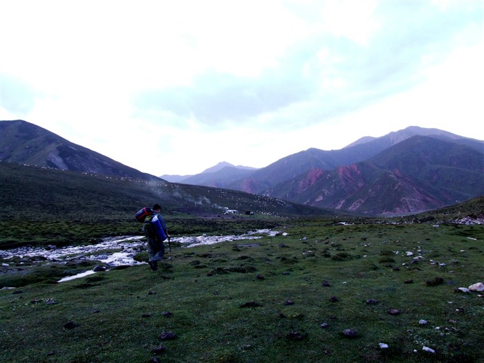 行走在无际的草甸上,脚下是草甸,远处是草甸,唯有身旁的马牙雪山在守望着我们的前行。先前看到天池的那种兴奋劲已经过去,长时间负重徒步高原,使我们的脚步越来越沉重起来,连抬起相机拍几张相的力气都不想出了。峡谷沟边不时有牧民的临时房子从眼前晃过,感冒的病毒在身体里开始发酵,行走的姿态如同半醒半睡的状态,好在这三个多小时的路程不算很长。。。。。。