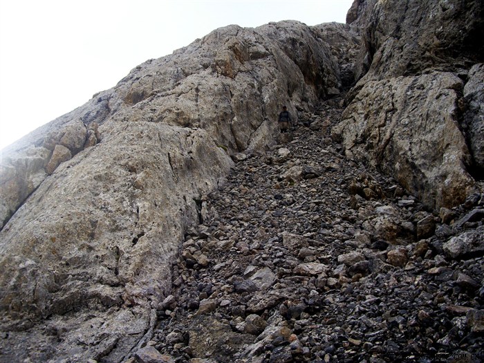 此时坡度七、八十度,兄弟们时时在石坡上等着我龟速的爬行,看来要拖进度了,爬三步石坡就下滑一歩,不时还要注意坡顶滚落的石头,想抬步可就是抬不起来那沉重腿,喘得厉害。。。。。。