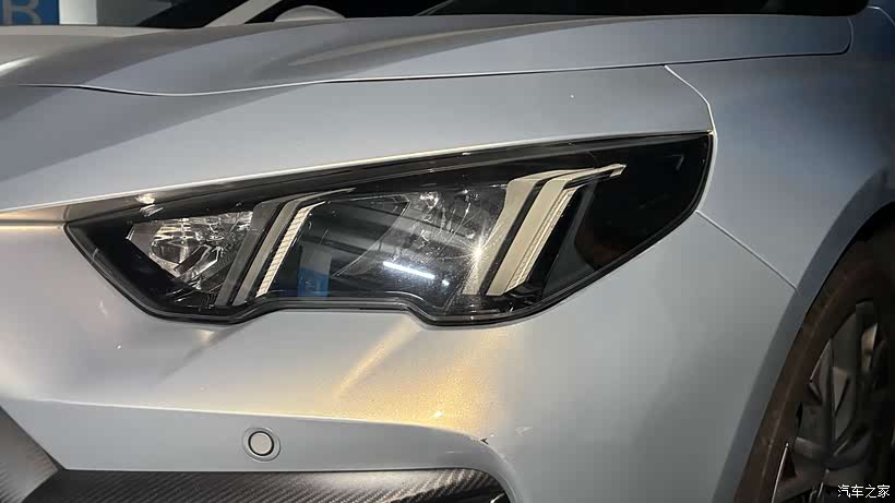 广汽传祺影豹以“机甲”前脸先声夺人:大尺寸六边形格栅内嵌獠牙式碳纤维饰板,搭配锐角LED大灯,低趴宽体1850 mm,0.773黄金高宽比,一眼即显战斗气息。车侧大溜背与上扬双腰线一气呵成,4753 mm修长车身蓄势待发,18英寸熏黑刀锋轮毂与橙色R标卡钳点缀,动感爆表。车尾最吸睛:原厂黑色战斗尾翼集成高位刹车灯,下方双边共四出排气粗壮外突,配合扩散器,声浪未起气势已燃。专属“影豹蓝”金属漆在阳光下呈现深海到炫目的渐变,回头率满分,堪称10万级最飒性能轿跑。