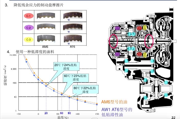 今天在寻找相关材料的时候,不经意发现了来自神龙的一篇技术教材,着重介绍了新型的AT6和老版的AM6的异同点,其中老版的AM6变速器使用的是符合JWS3309的变速箱油,而新版的AT6,则使用了低粘度的变速箱油。今后不要再争论AW-1有高粘度和低粘度两个标准,或者AT6变速箱应该使用高粘度油之类了。AW-1相对jws3309,在各个温度区间上粘度下降了大约22%。以标准的JWS3309变速箱油美孚3309来对照典型性质美孚ATF 3309粘性CST @ 100oC 7.2CST @ 40oC 35CP @ ...