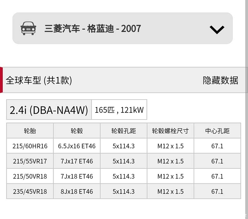 三菱格蓝迪07款的轮毂尺寸有215/60 R16和215/55 R17两种规格。孔距:5×114.3,中心孔:67.1mm。你淘的福克斯改装轮毂对不上,可能是因为中心孔尺寸不同,或者轮毂的偏距等其他参数不适合三菱格蓝迪。