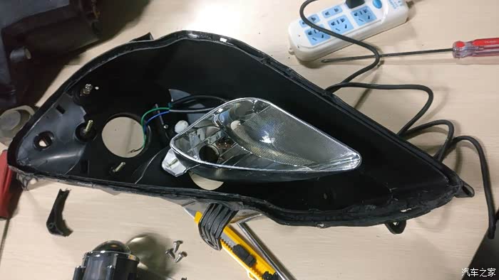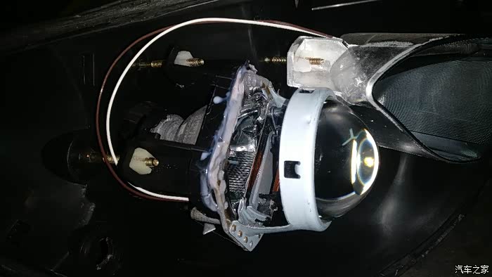 因为两个人封灯,吹热了把蛇胶马上装到灯罩槽里,所以没拍照,后面又用钳子把灯罩和座子***在一起,费了不少劲,装上车,还得调下灯光远近。直到完工,才有空照几张照片。在装的时候顺便把不亮的雾灯弄了下,结果是插头松了,用扎带扎紧。