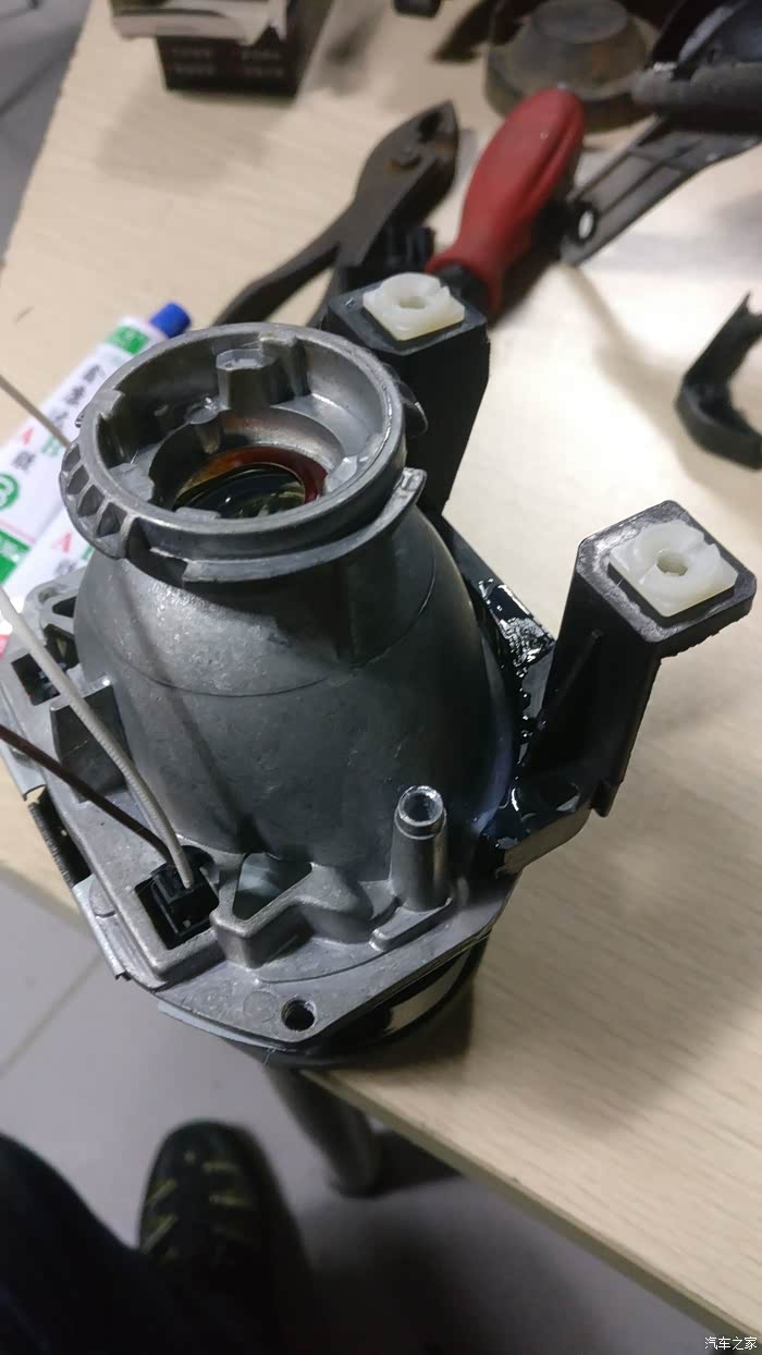 取透镜:原厂透镜比较小,新买的透镜没有买支架,也比原厂大一圈,装不上去,但我又想保留原车电动调节功能,只有把支架弄断,用AB胶粘在透镜上(不知道后期透镜温度太高会不会把AB胶烤化,有风险)。清胶找了朋友一起弄,已经弄了一个多小时了,胶真的难清!