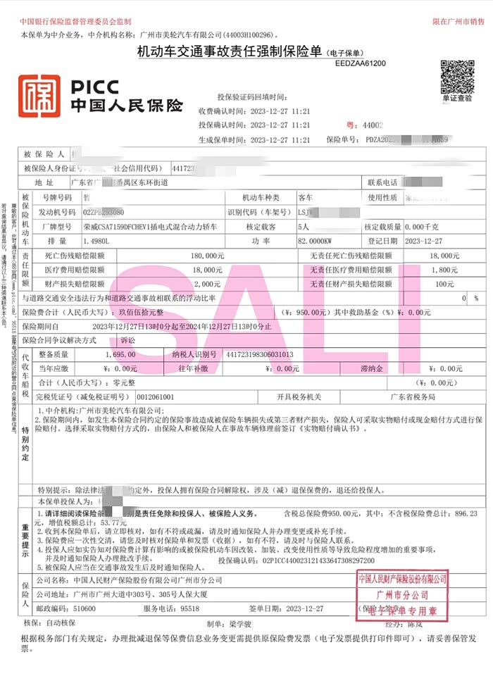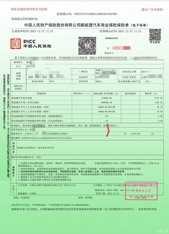 首先,作为一辆新能源汽车,我认为保险费用会比油车高一些,保险总价为 4894.06 元。强制保险是必须购买的,这一点没得商量,新车价格为 950 元。