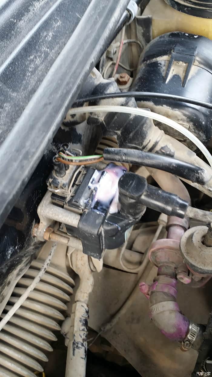 有一天早上发动机无法启动,经过检查发现是点火线圈开裂漏电,索性用AB胶先粘一下,完美解决。