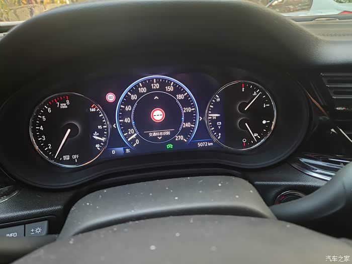 可以看到交通标志识别是横线,说明无法实时获取路标。我前一台科鲁兹改装过,在我每天上下班走的这条路上是可以实时获取到路标后反应在仪表上的。一个很显著的证明就是,我如果跟在大巴车后面,大巴车尾上贴的一个限速100的标记,会被识别出来。这个跟导航没有任何关系。而且科鲁兹更没有人机。