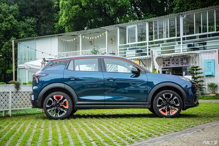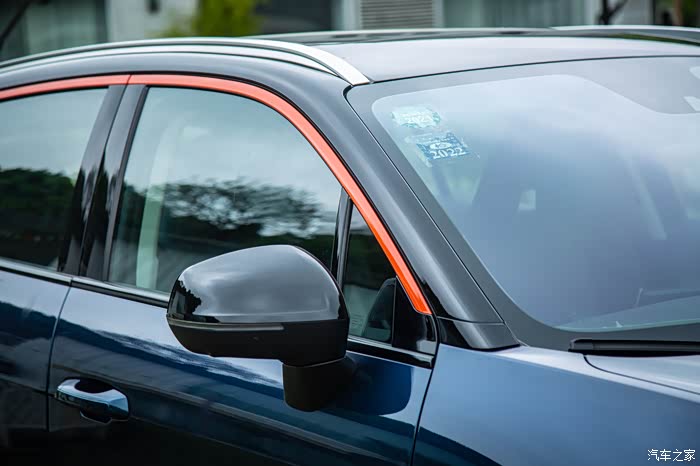 这台领克06使用了黑色的悬浮式车顶设计,并且在上方加入橙色点缀。