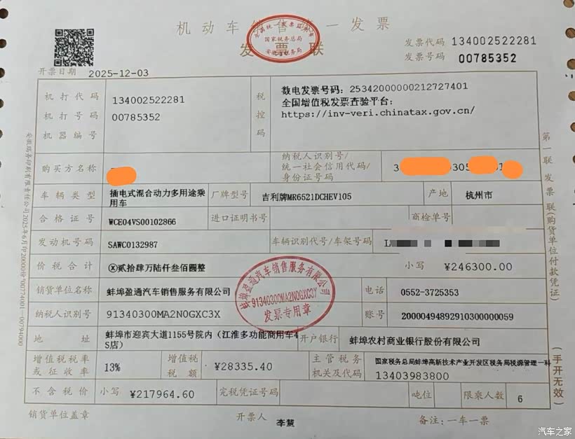 我买的这款车子是,248800的四驱顶配加上了13,000的选装件。然后店里销售给我用了一个小订的权益。所以综合优惠了15,500的价格。所以我的落地价格是246,300。因为是去年12月份买的,然后不需要交购置税,然后当时因为还有地方的区补20万以上的话是8000块钱区补。