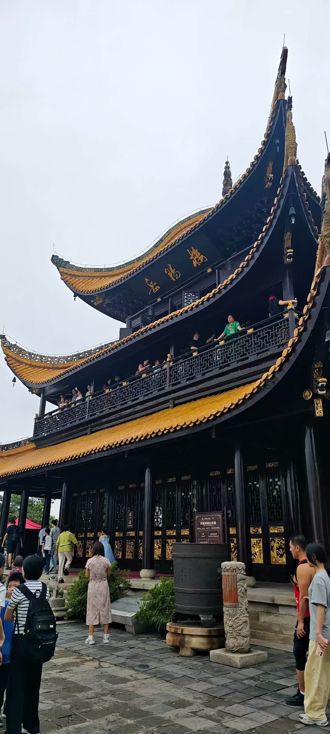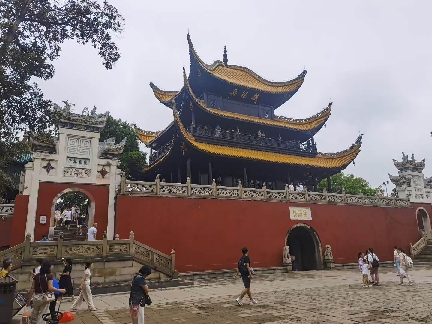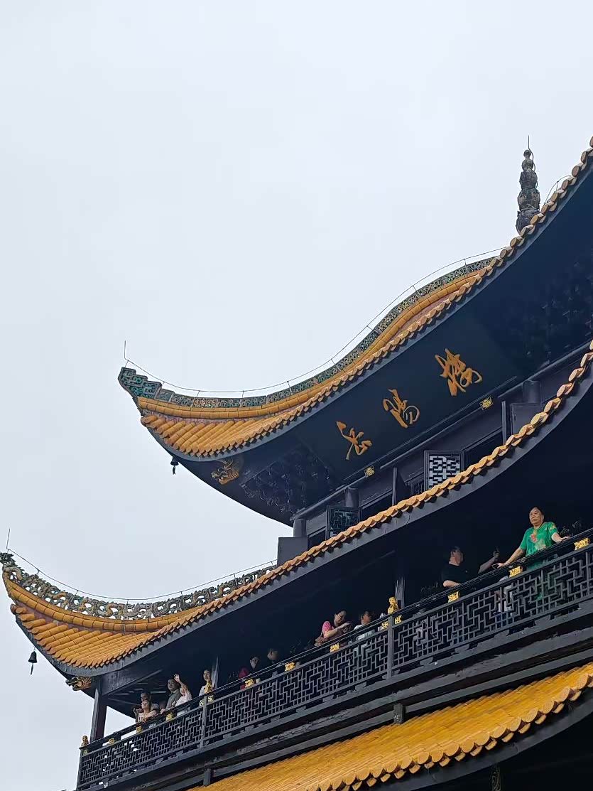 沿着回廊前行,便来到了岳阳楼的主楼前。岳阳楼整体为纯木结构,没有一颗铁钉,三层飞檐的盔顶设计巧夺天工,凌空如意斗拱更是让人惊叹古人的智慧和技艺。这种大型的盔顶结构在国内独一无二,就像一顶将军的帽子,威风凛凛又充满艺术感。楼前的楹联“四面湖山归眼底,万家忧乐到心头”,更是将岳阳楼的意境和内涵展现得淋漓尽致。